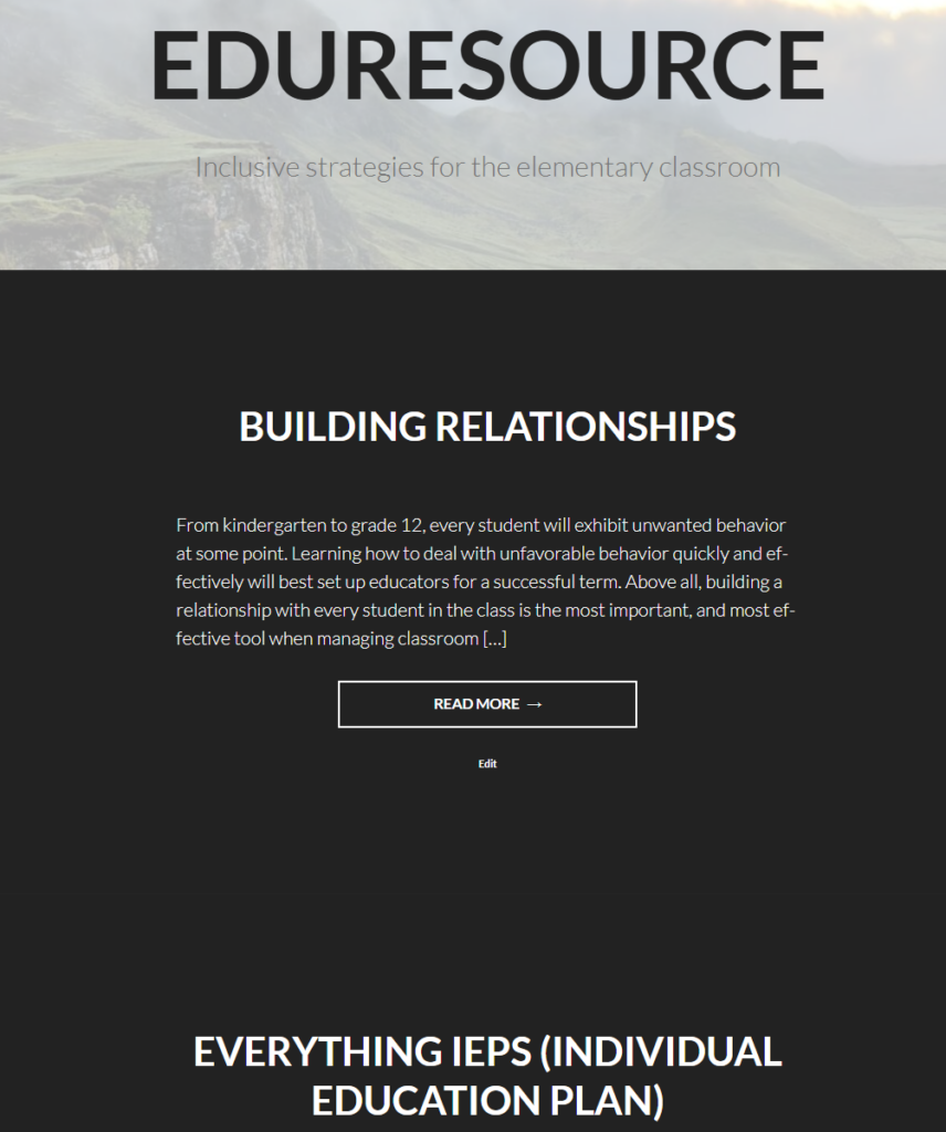 As part of our Bachelor of Education program, we’ve been instructed with the task of developing a professional resource. This resource is meant to aid us in the field, and should be accessible to other educators. For my resource, I thought it would be the perfect opportunity to make a 2nd blog also on WordPress. I figured what could be more accessible than I website, so I created Eduresource. Eduresource is a website where educators can view inclusion strategies for the classroom. I focus primarily on students with complex needs and behavioral aspects.